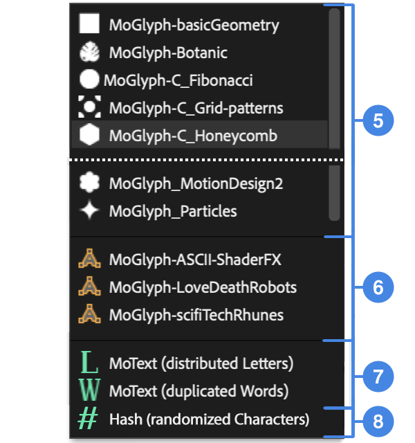 The first part of the dropdown list features all the fonts that have been designed by the creator of MoglyphFX and that are delivered with the toolset. They are identified by a different white icon, each representing what the fond is about (a square for “geometric”, a leaf for “botanic”…), but not necessarily the shape you’ll be cloning by default (the cloned shape will always be the very first Gyph-01 shape available in the font, which is defined by the “!” exclamation mark on the keyboard).