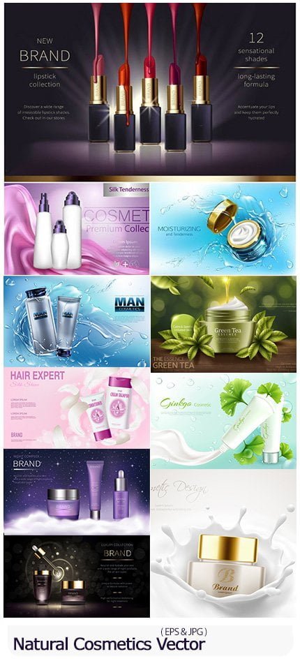 In this section, you will see 12 vectors of ready-made cosmetic designs for advertising poster design, which are available for download in EPS and JPG formats on the site.