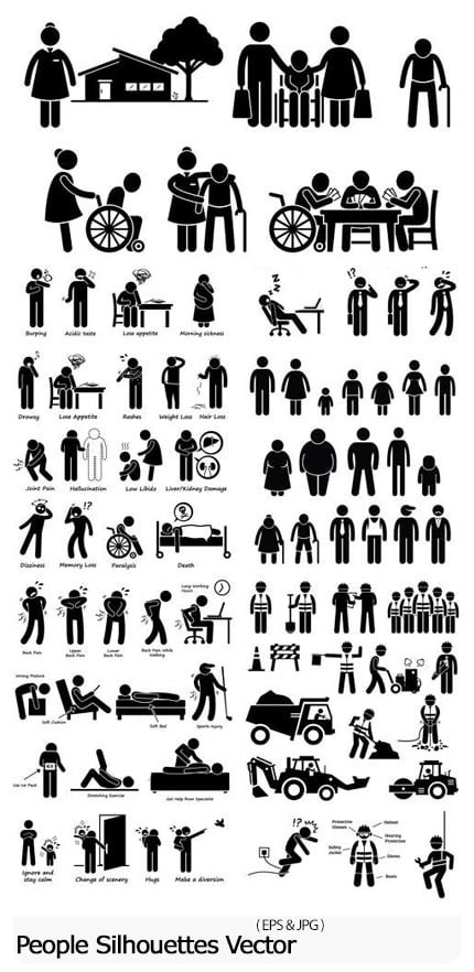 This section includes 10 shadow vectors of people with different jobs and states such as angry, worker, sick, elderly, playing, exercising, etc., which are available for download in EPS and JPG formats on the site.