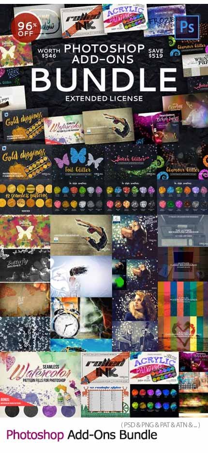 In this collection, you will see various Photoshop tools such as brushes, styles, patterns, clip art, etc. It is available for download in ASL, PAT, PNG, ABR, ATN, and JPG formats.