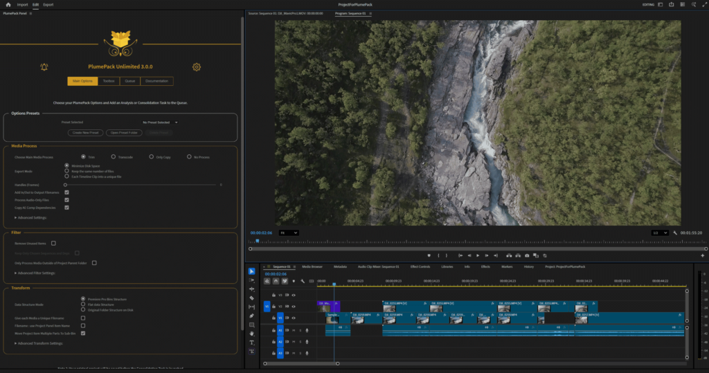 PlumePack collects your PrPro projects & trim medias to make it lightweight: Trim, Archive, Organize and more! NEW: Transcode, Queue, Presets.