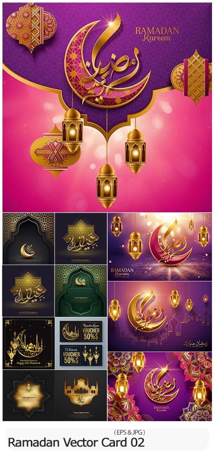 18 vector postcards and typography of the holy month of Ramadan and Eid | 137 MB | With preview | EPS & JPG format