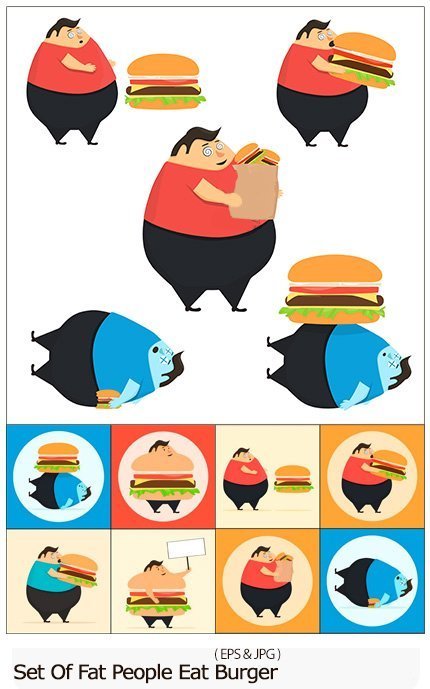 In this collection, you can see 11 vector images of fat people eating hamburgers, which are available for download in EPS and JPG formats on the site.