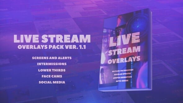 Stream Overlays Pack for After Effects is a great tool for get-up your live stream design to the next level. There are more than 170+ scenes with looped animation ready to use with just one click. Free AtomX extension allows you to live-preview all visual assets, customize text and colors without messing with layers.