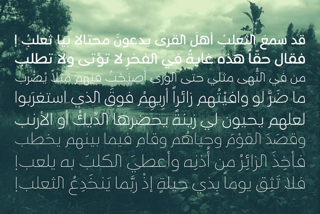 The word Taleeq is the Arabic for Fluent (or Freed). Taleeq is an Arabic typeface with a chirographic flavour. It consists of three weights and it suits various applications including publication, print and advertising.