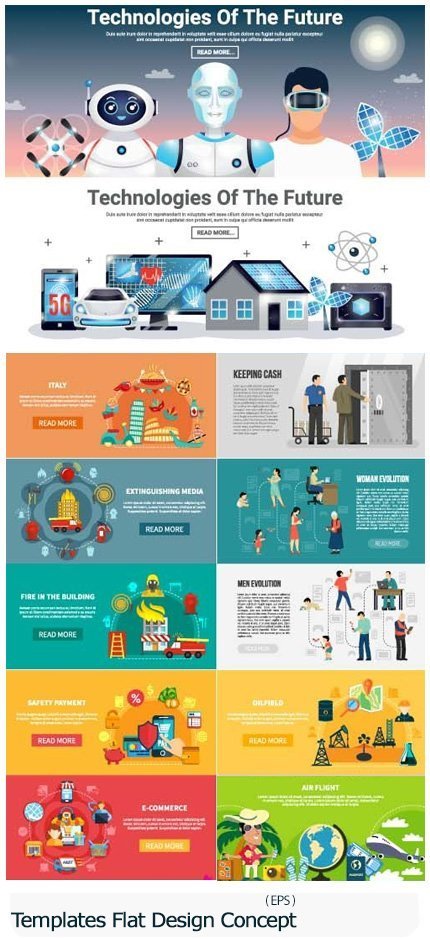 In this collection, you will see 15 vector images with the title of ready-made templates for flat concept banners, which are available on the site for download in EPS format.