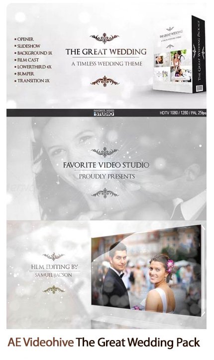 Wedding Aftereffect project collection including transitions, slideshows, transitions, etc., along with video tutorials from VideoHive | 921 MB | AEP & MP4 format