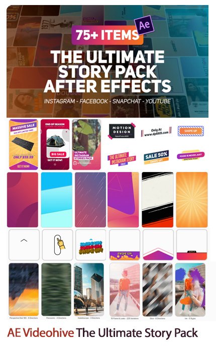 This collection includes a pack for making Instagram, YouTube, Facebook and SnapChat stories in Aftereffect video, which is available on the site in AEP format.