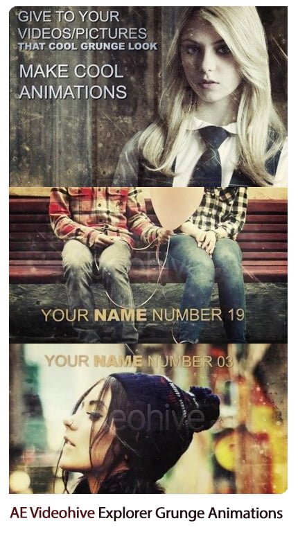 the grunge look were made in after effects no pre-renders.Awesome look.Work great with any kind of pictures or videos ,dynamic moves and much more.Its very easy to customize you will need to Drop & Drag your media in the project file and insert your text – also if you want you can always play with some settings – like color correction ,but this is up to you ! Help file included.Film burn included.NO PLUGINS USED !!!