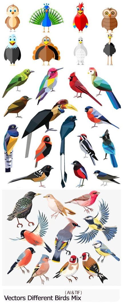 Vectors Different Birds Mix 9 cartoon vector images of various birds, owls, peacocks, pigeons, parrots, ostriches and … | 18.7 MB | Comes with preview | AI & TIF format