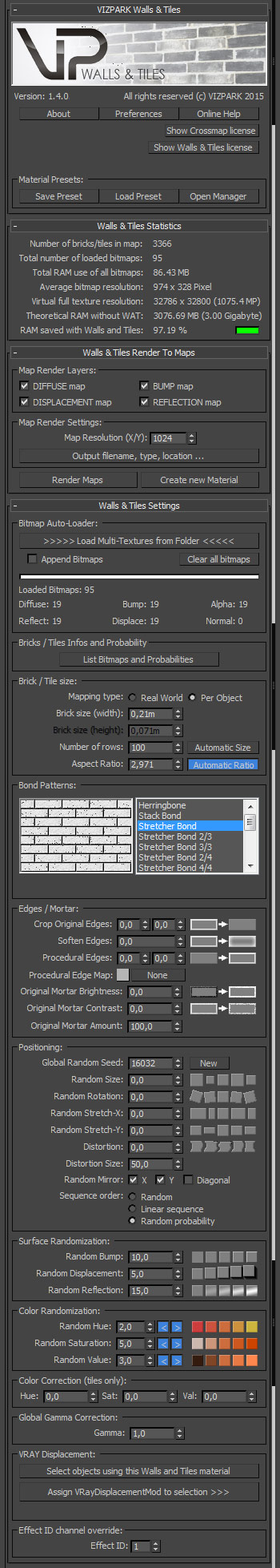 WALLS & TILES is a very easy-to-use 3ds max material that creates procedural walls and floors based on multiple single bitmaps. Now including ALL WALLS with 75 walls and floor multitextures.