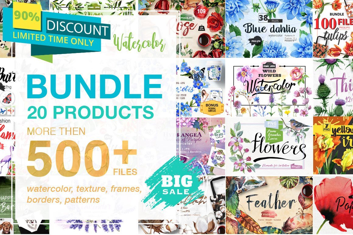 Watercolor Mega Bundle 20 Sets With Over 500 Graphics